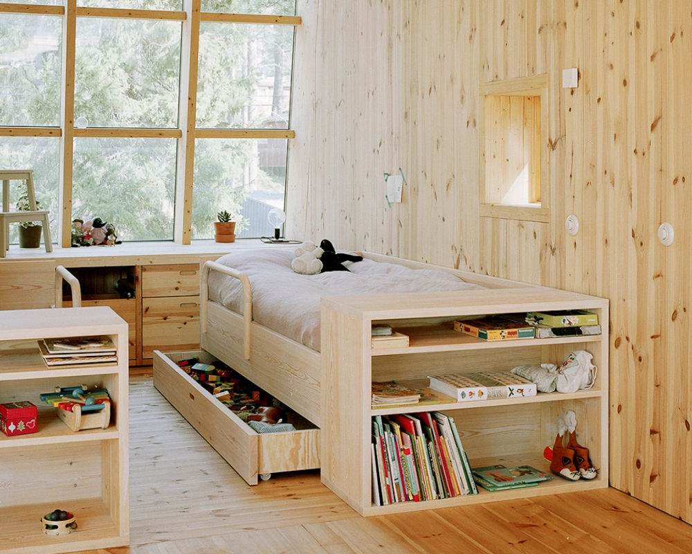 Haciendo gala de la maestría nórdica a la hora de proyectar estructuras en madera maciza, este material versátil aparece por toda la villa. Como armazón y revestimiento externo, creando el mobiliario de la cocina, en forma de escaleras, armarios empotrados, estanterías, camas o puertas correderas, es el componente que proporciona calidez y sabor de hogar.