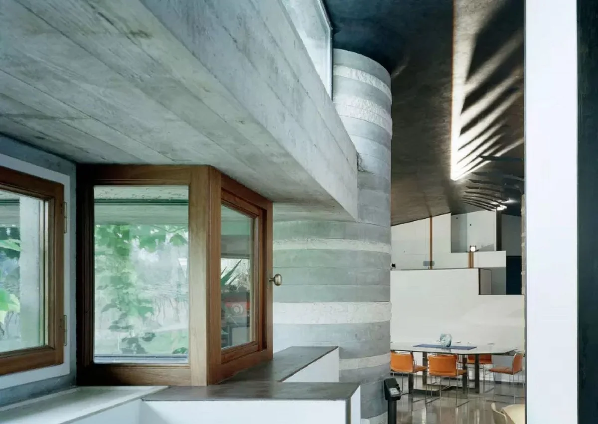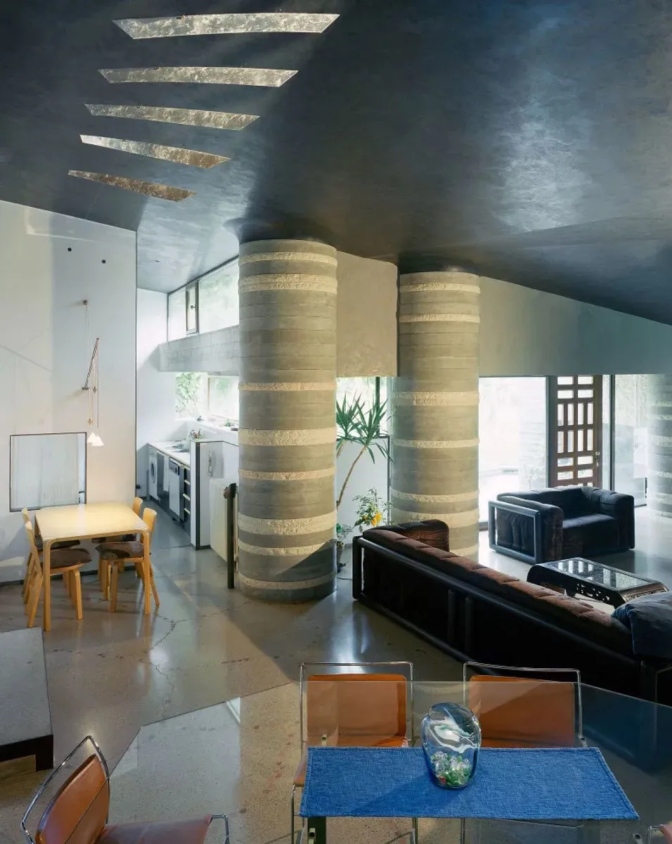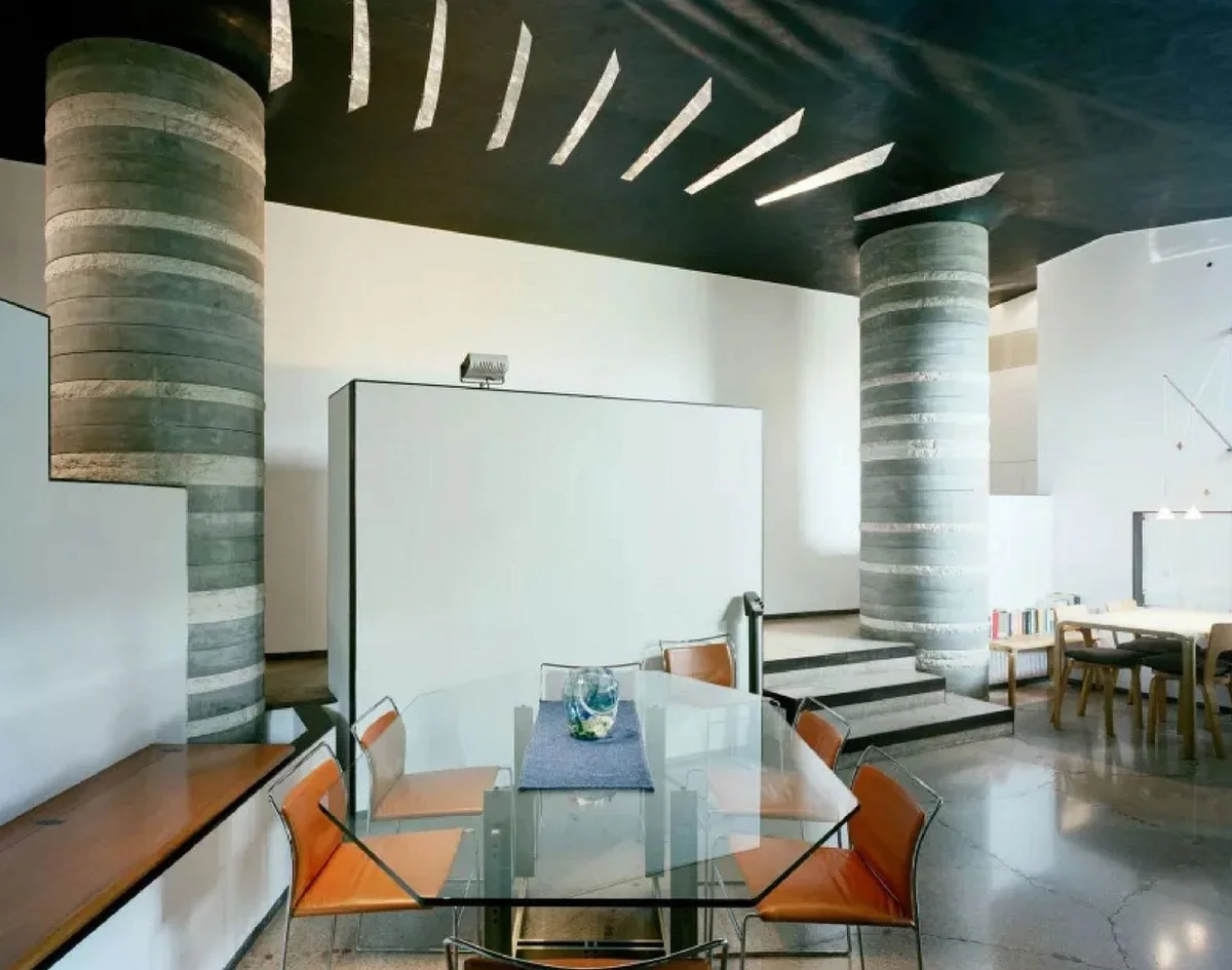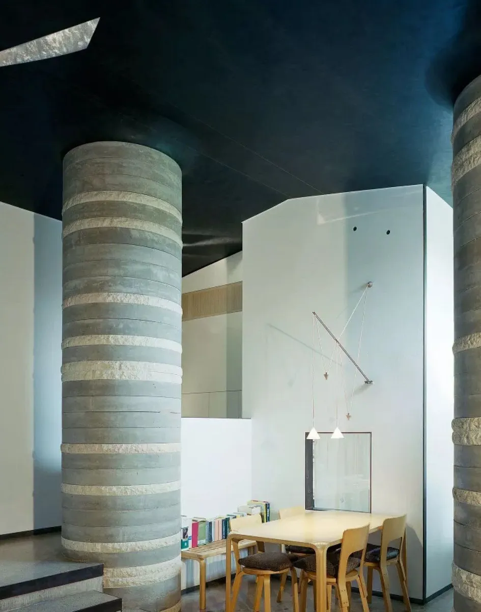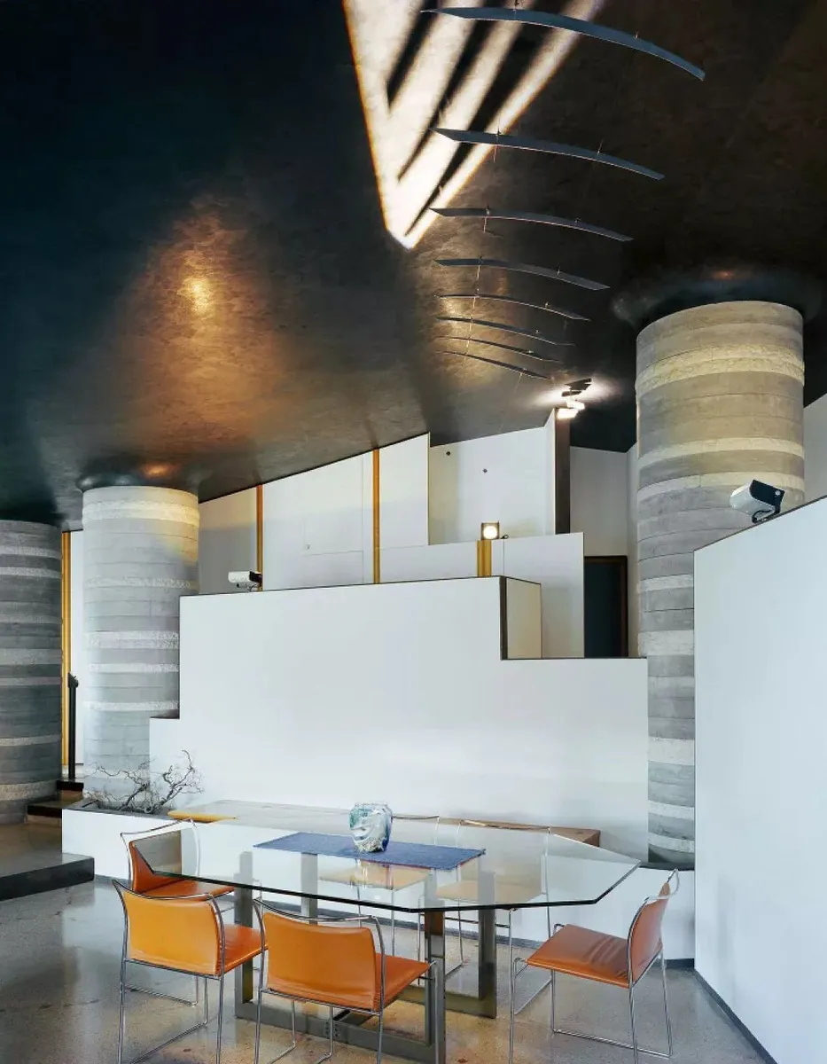 El interior se sostiene mediante nueve pilares cilíndricos realizados en hormigón y secciones de piedra —Prun y Trani— que organizan niveles: salón, comedor, cocina y baños se encajan sin muros bajos, generando continuidad espacial. La osamenta estructural, pese a su escala, no pesa gracias a la compacidad y la proporción precisa.
