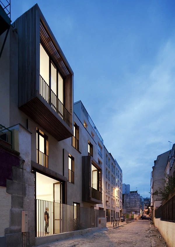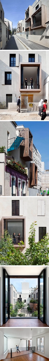 El estudio de arquitectos Moussafir recibió 3 parcelas ubicadas en 2 estrechas calles paralelas, separadas por un largo edificio de viviendas a baja altura; un jardín privado organizado en el medio permite la interacción entre las dos partes del proyecto. En estas 3 parcelas se construyeron 9 casas y 3 estudios para artistas . El proyecto pretende no desentonar con la escala y densidad del barrio aunque sí potenciar el espacio y la luz del día para los futuros residentes. Los estándares requeridos para vivienda social son muy restrictivos con los m2, por lo que los arquitectos decidieron diferenciar los volúmenes interiores, creando un valor espacial añadido que, consecuentemente, incrementa la luz natural. Un alineamiento perfecto con el resto de edificios y el tratamiento idéntico de la fachada con el resto, asegura la integración total del proyecto, eliminando la diferencia entre lo antiguo y lo nuevo.
