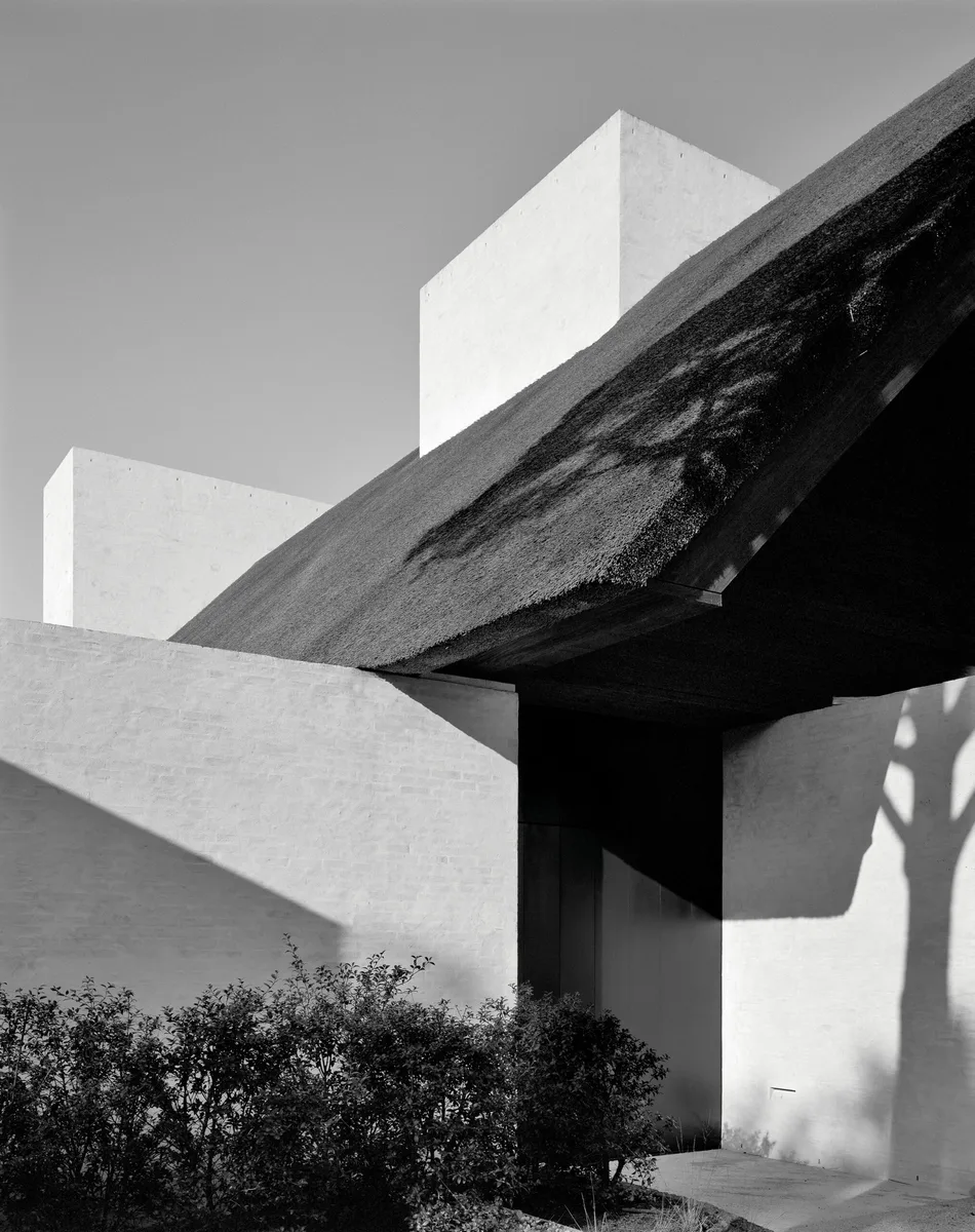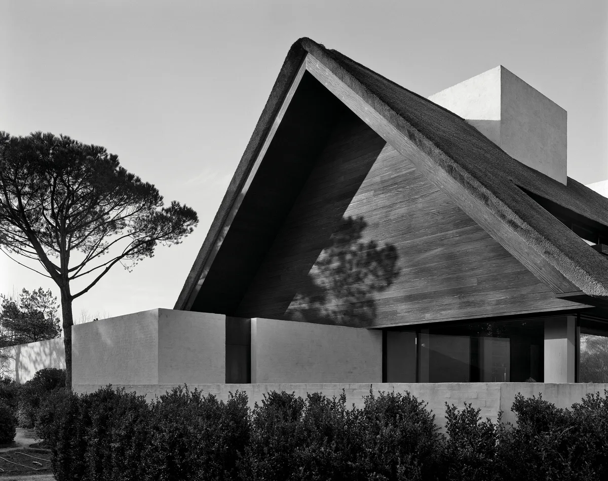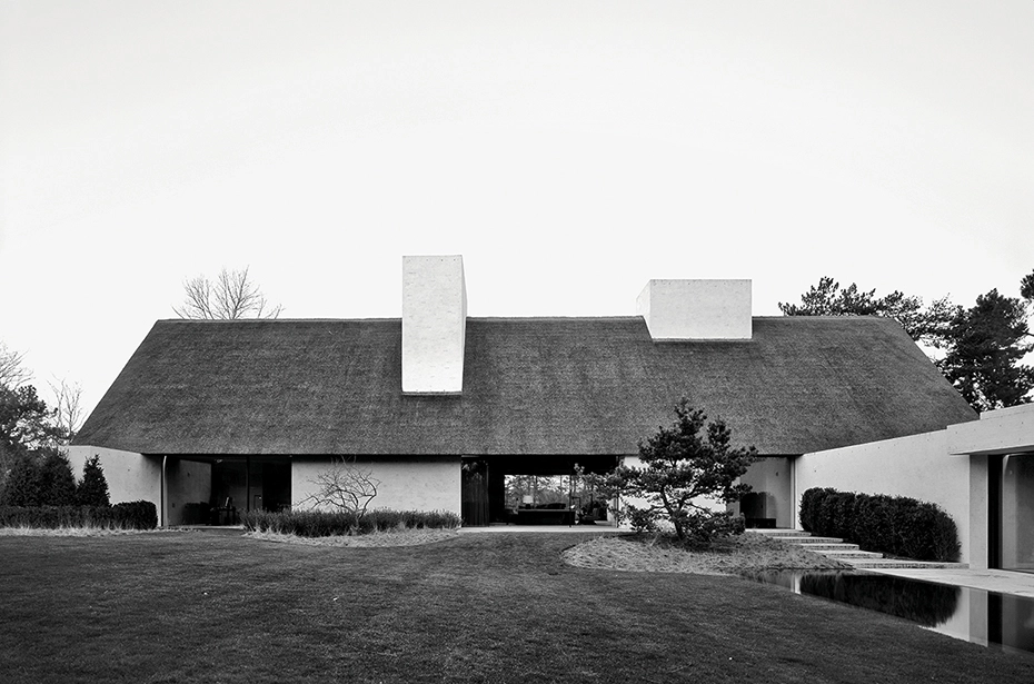 Unos enormes volúmenes blancos sostienen el gran tejado de paja. En un primer momento pueden parecernos bloques de hormigón, pero un vistazo más cercano nos revela su verdadera condición: monolitos de ladrillo encalado dispuestos dentro de un entorno natural. Porque al estar situada junto a un famoso campo de golf, el propietario disfruta de hermosas vistas de las praderas y los jardines privados, diseñados por el paisajista Martin Wirtz.
