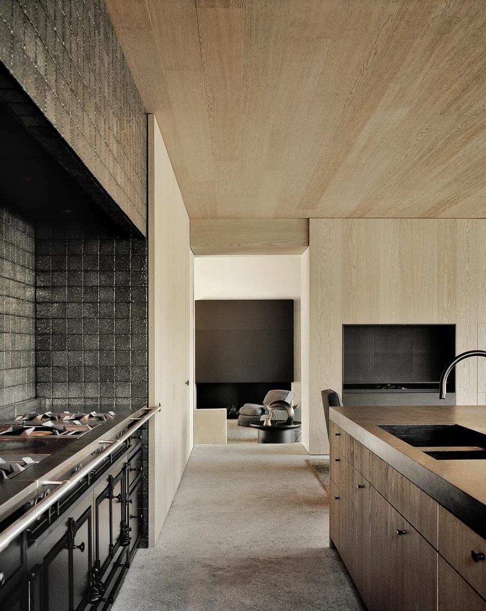 Respecto al interior, hay una mezcla de texturas que enriquece la atmósfera general. Destaca particularmente el salón, con doble altura y techo en tono muy oscuro, y la cocina, revestida con madera natural –techo incluido– y azulejos brillantes color antracita. Y como guinda del pastel, el ambiente sofisticado se acentúa gracias a un elegante mobiliario a medida, que contrasta con la crudeza de la paja y el ladrillo.