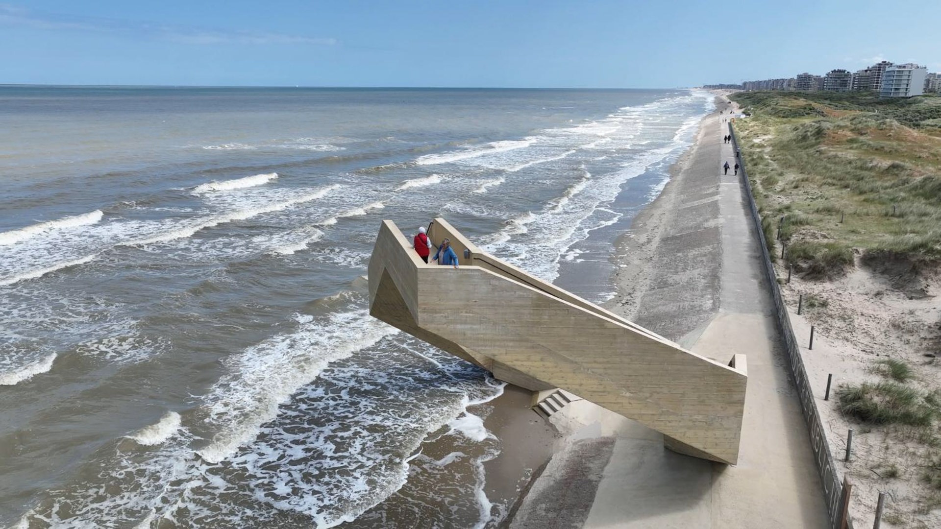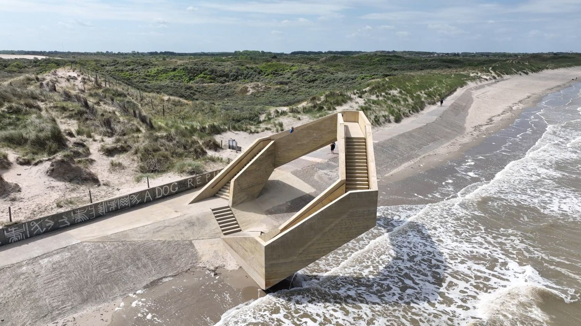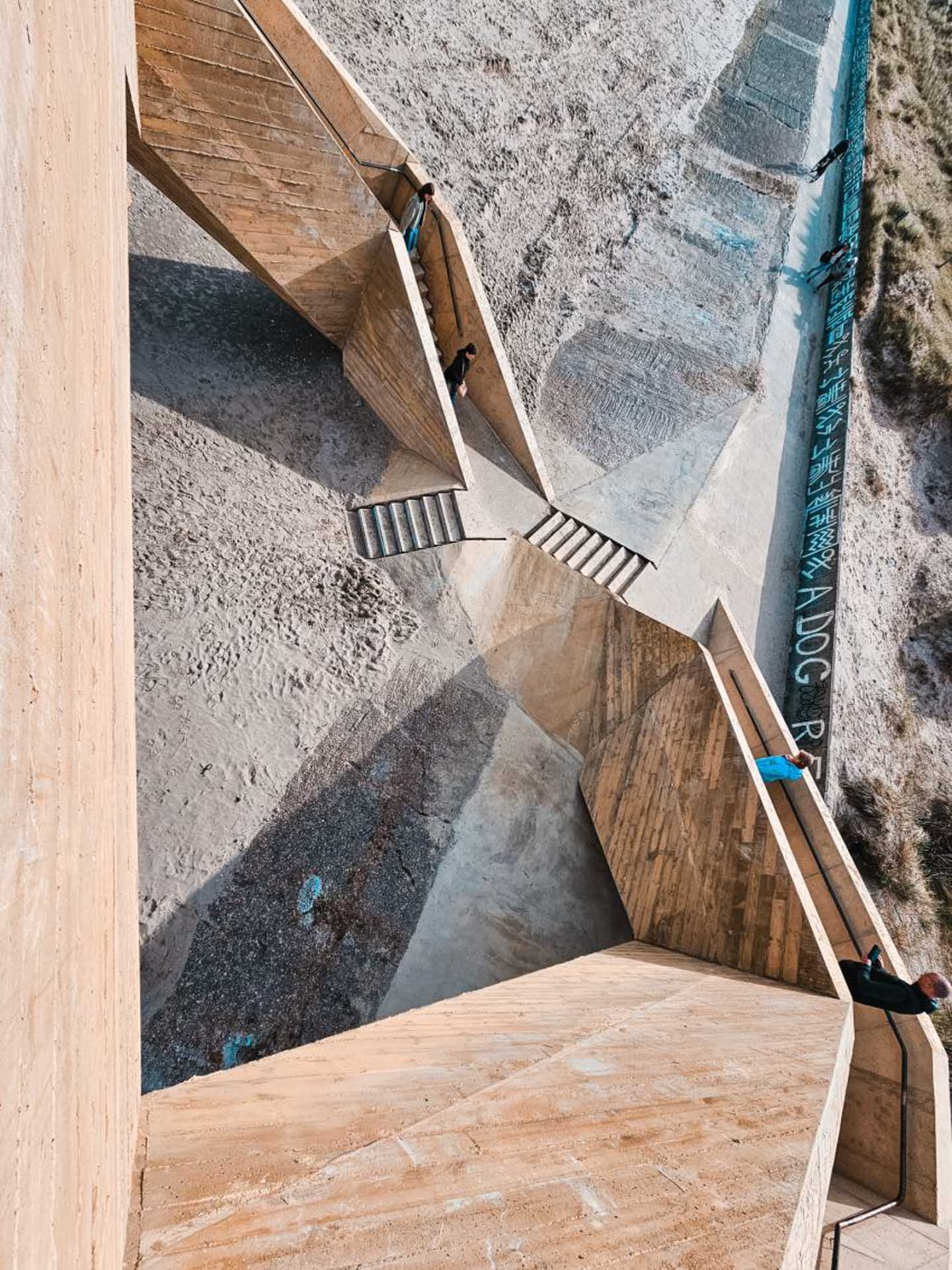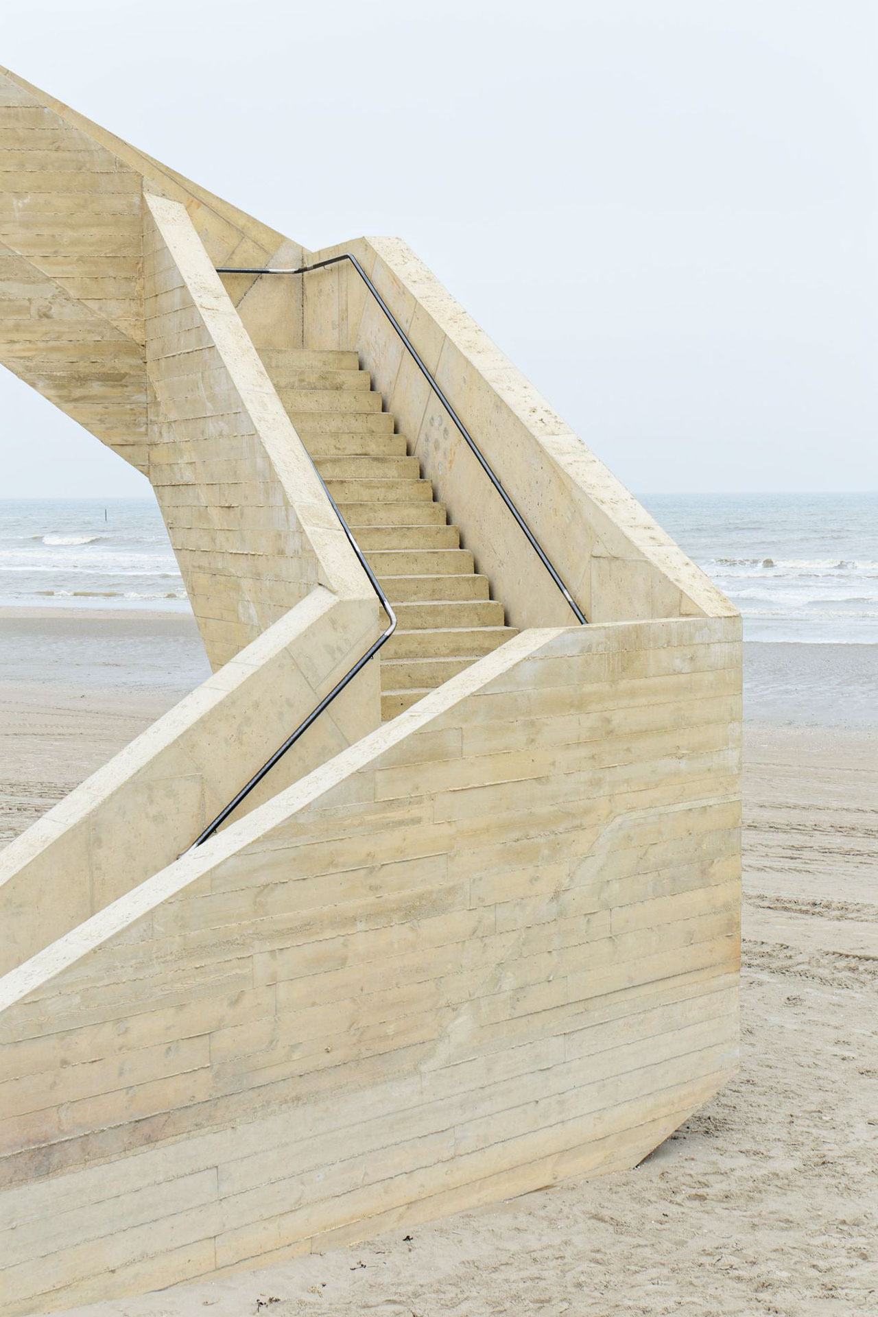 Una escalera escultórica de hormigón guía al visitante hacia una pasarela elevada. Desde ahí, el recorrido permite nuevas perspectivas sobre el mar, la playa y el dique. Finalmente, el camino desciende de nuevo, integrando el gesto arquitectónico en el sistema existente.