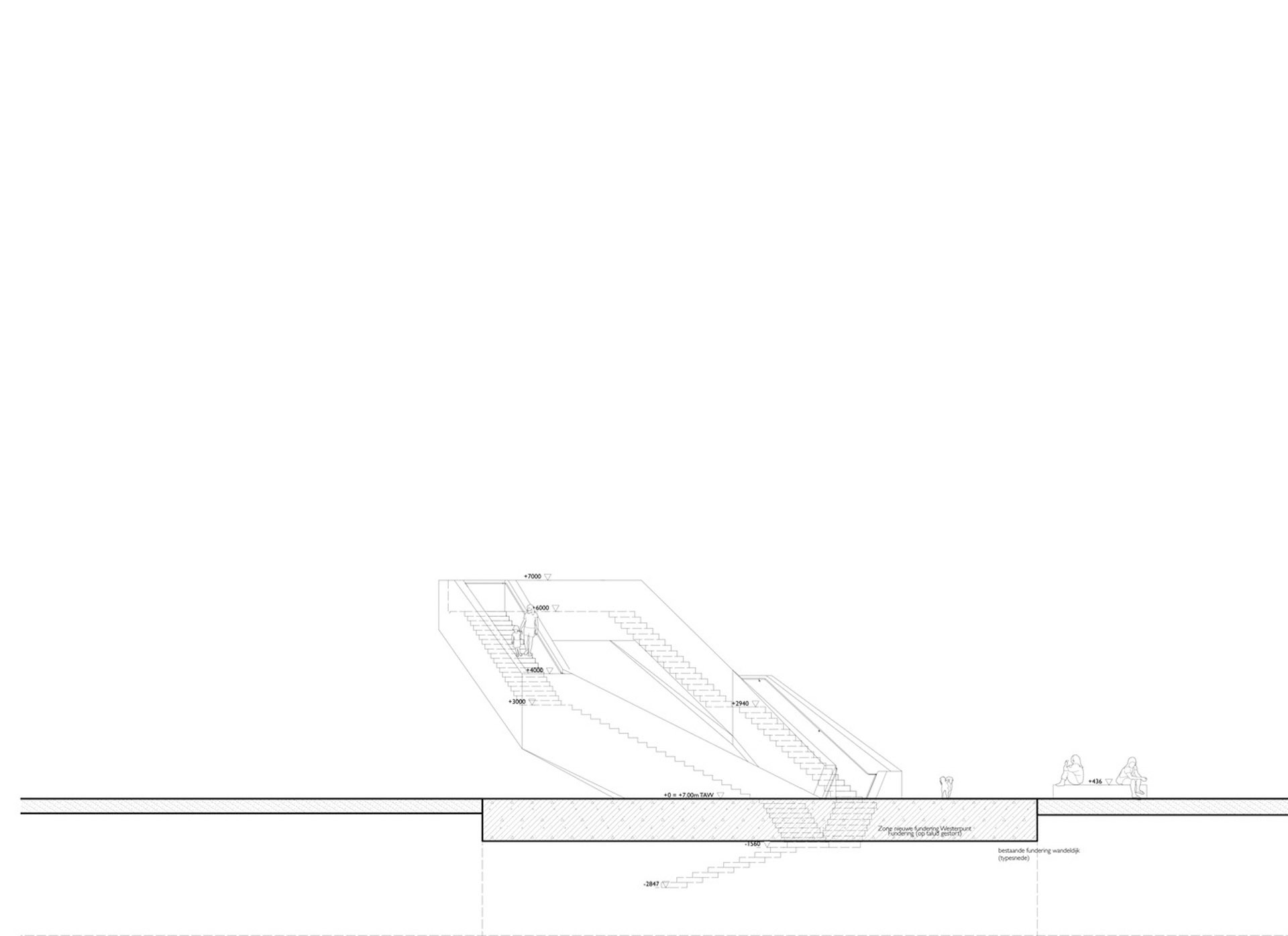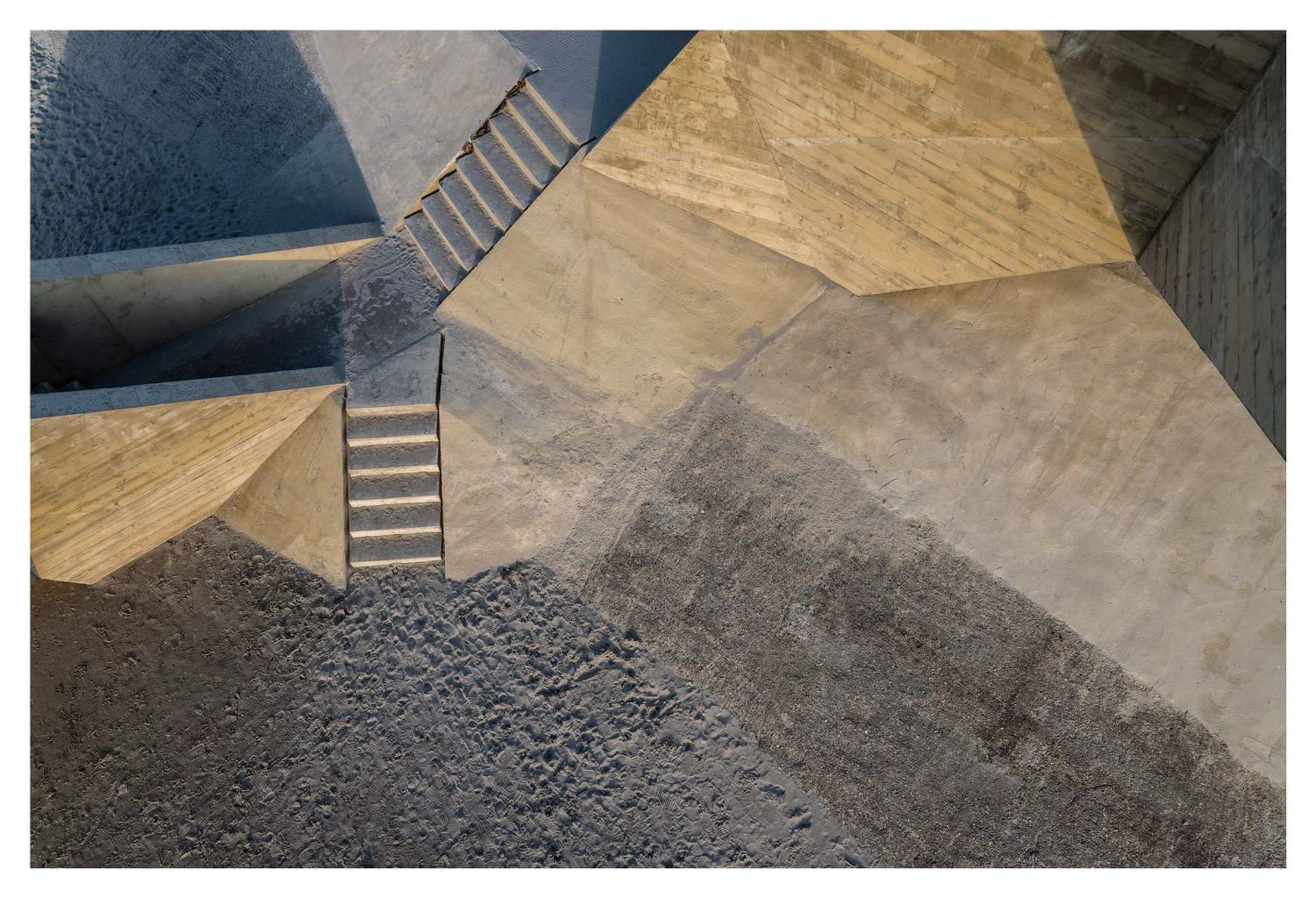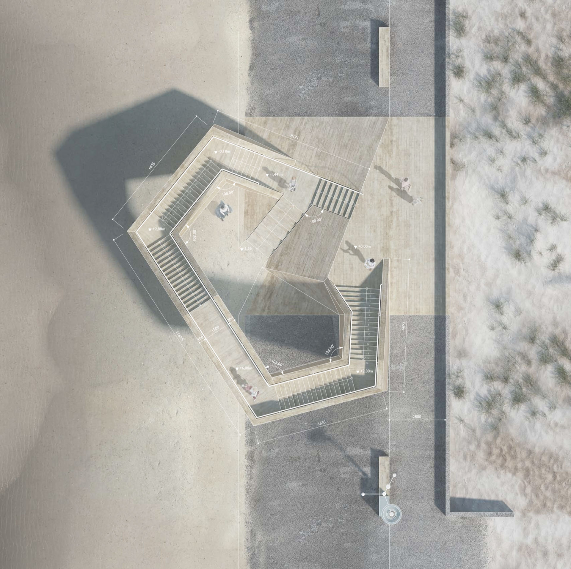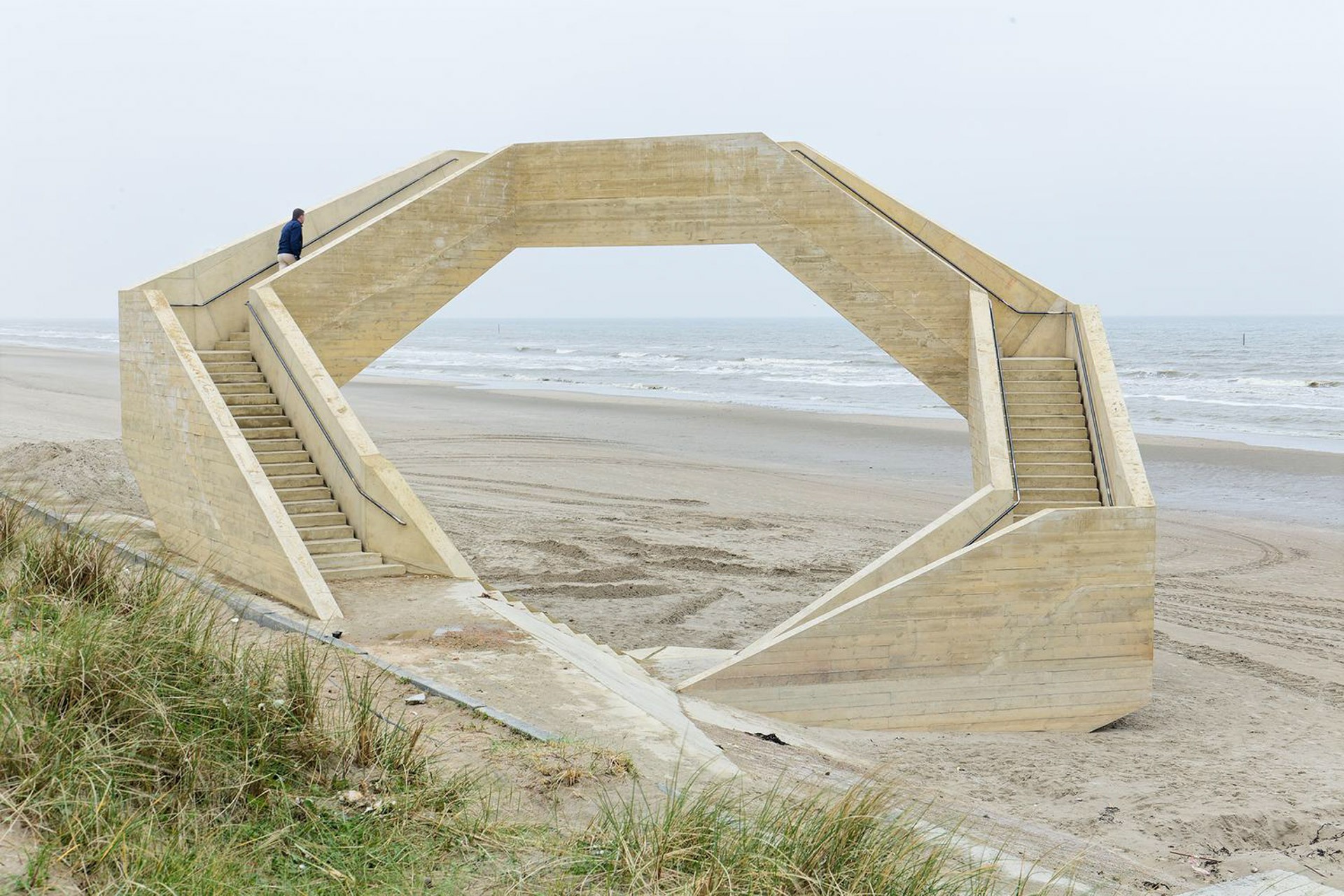 Una escalera escultórica de hormigón guía al visitante hacia una pasarela elevada. Desde ahí, el recorrido permite nuevas perspectivas sobre el mar, la playa y el dique. Finalmente, el camino desciende de nuevo, integrando el gesto arquitectónico en el sistema existente.