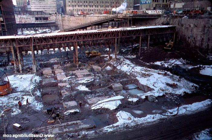 En 1965 la autoridad portuaria comenzó a adquirir terrenos para el complejo WTC. Los trabajos de demolición de 13 manzanas de edificios de baja altura en Radio Row comenzaron en 1966. La torre norte empezó a construirse en Agosto 1966 y le siguió la construcción de la torre sur. Los 917.000m3 de material extraido en la excavación de los cimientos se utilizó para expandir la costa de Manhattan frente a West Street y formar el nuevo Battery Park. Un acuerdo entre las autoridades de Nueva York y Nueva Jersey consiguió derogar el sistema de construcciones de 1933 por uno nuevo que abarataba costes y ampliaba el espacio alquilable.
