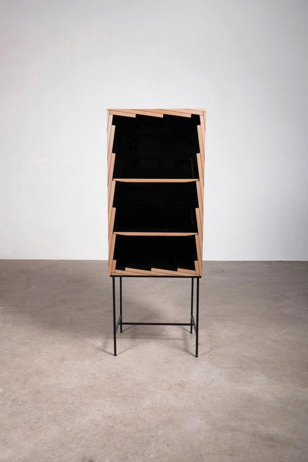 La rotundidad de líneas y la potencia visual de la estantería se ve equilibrada por unas finísimas patas de acero lacado. Por su parte, esas aristas interiores tan marcadas sirven de apoyo natural para las baldas sin necesidad de fijaciones adicionales.