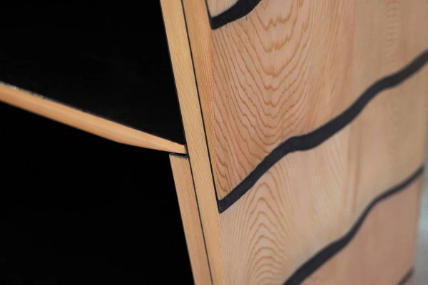 Y si en los laterales se buscaba esa fusión perfecta, en el frontal se perseguía justo lo contrario. Las formas afiladas en zigzag de la madera le dan un aspecto muy llamativo, mientras que los tonos ocres y tostados del cedro contrastan radicalmente con el acabado negro brillante de la resina.