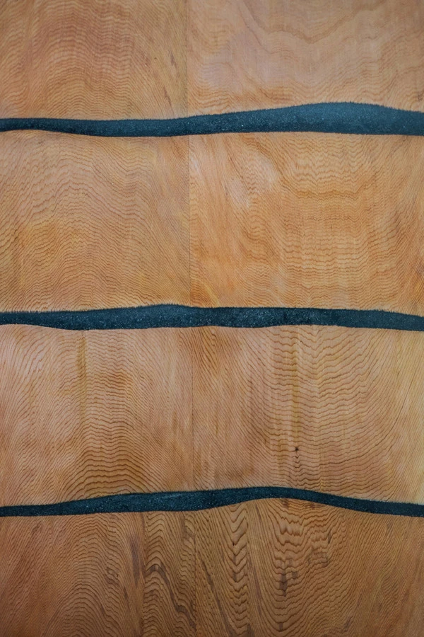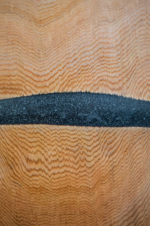 Por su parte, la resina perdió su brillo con el lijado, sacando a la luz la fina estructura granular de los materiales que contiene. De esta manera, se consiguió una auténtica forma orgánica en la que el borde deshilachado del cedro parece integrarse naturalmente en el mármol y el basalto.